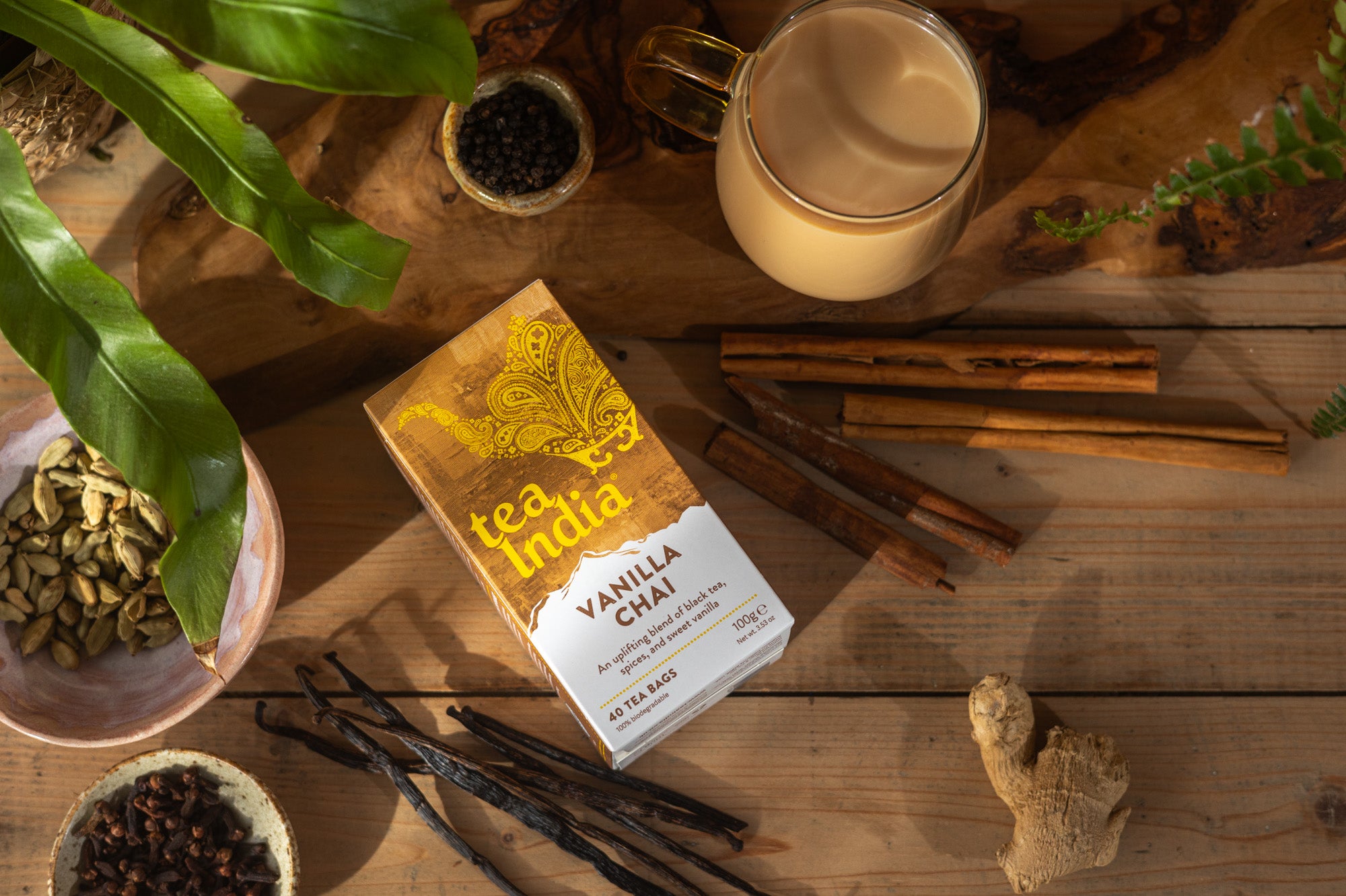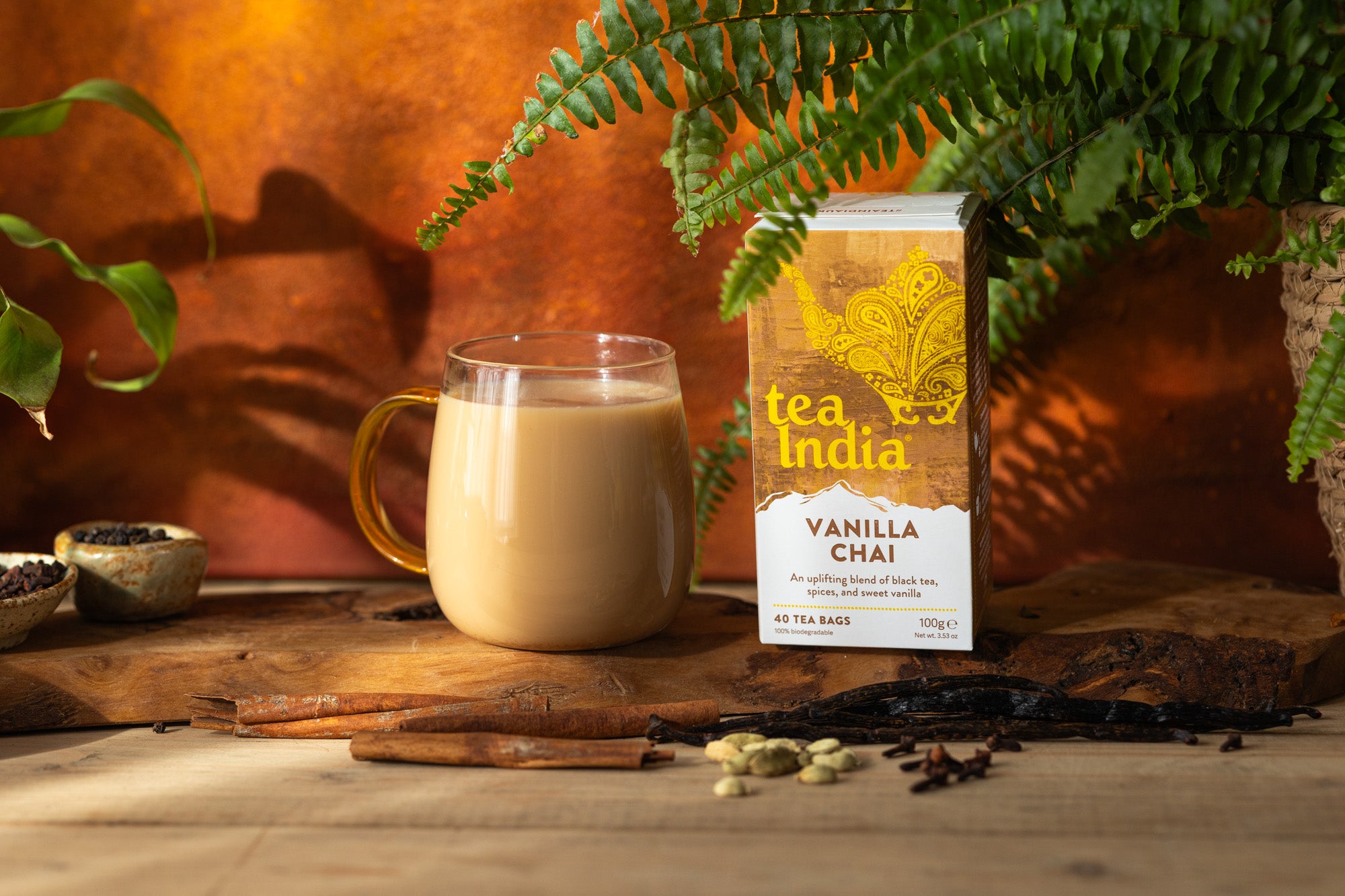An uplifting blend of black tea, spices, and sweet vanilla. Sweeten your day with our vanilla chai - a blend of bold black tea, fragrant spices and delicate vanilla sweetness. Crafted to brighten your day and inspire positivity. Perfect for moments needing indulgence or a pick-me-up.